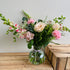 All of our bouquets and arrangements are hand made to order meaning each one is truly unique. The pictures show examples, and you can expect to receive jars and bottles featuring seasonal flowers similar in colour, style and texture.